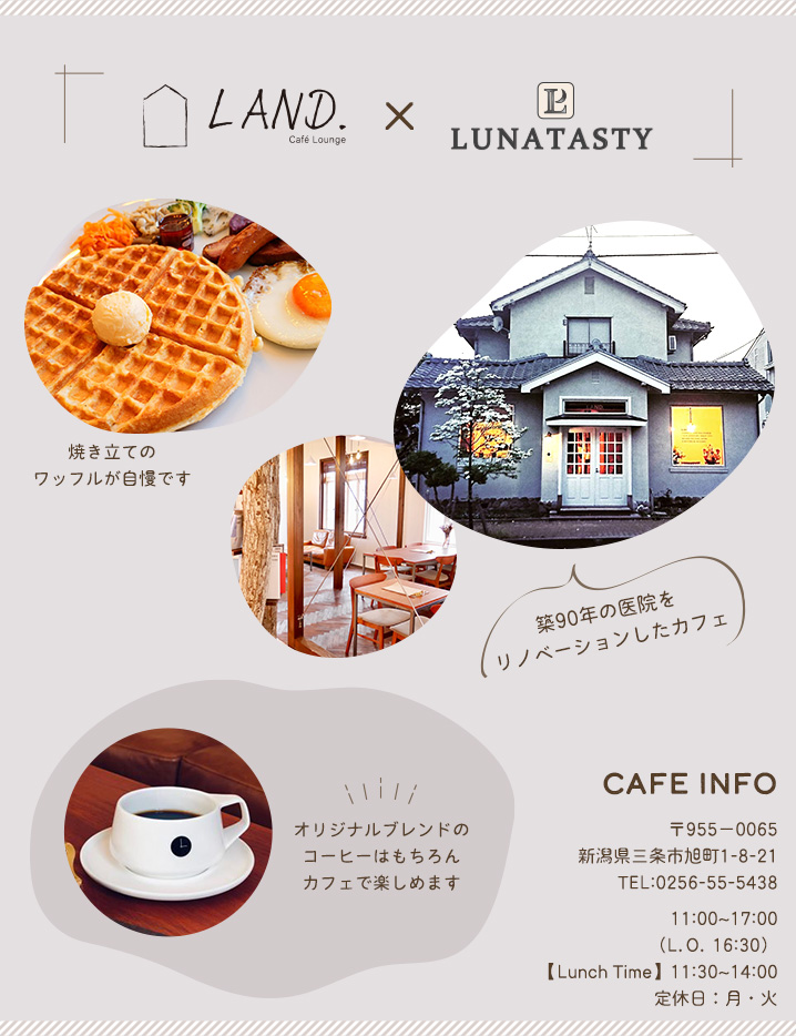 LAND.は築90年の元医院をリノベーションしたお洒落なカフェ。洋館風のレトロな雰囲気が印象的な建物で、焼き立てのワッフルやフレンチプレスのコーヒー、新潟県内産ハーブティーなどをお楽しみいただけます。